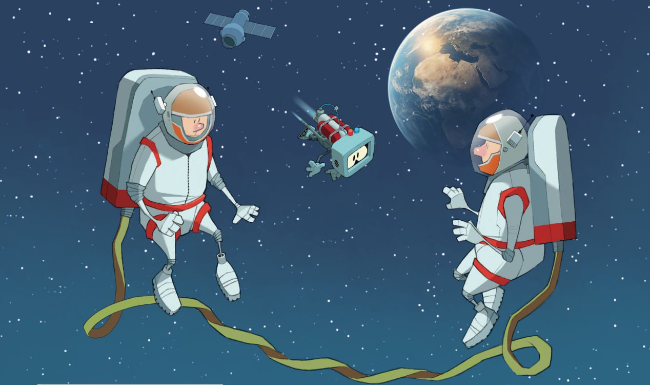 Два космонавта, находящиеся в невесомости за бортом корабля, соединены длинной лентой, концы которой жестко прикреплены к их скафандрам. Лента перекрутилась, что привело к техническим неполадкам, и космонавты потеряли всякую возможность двигаться, неподвижно зависнув друг напротив друга. Отважный Квантик может передвигаться в невесомости и хочет помочь космонавтам по возможности распрямить ленту. Как ему это сделать? (Изменять положение космонавтов он тоже не может)